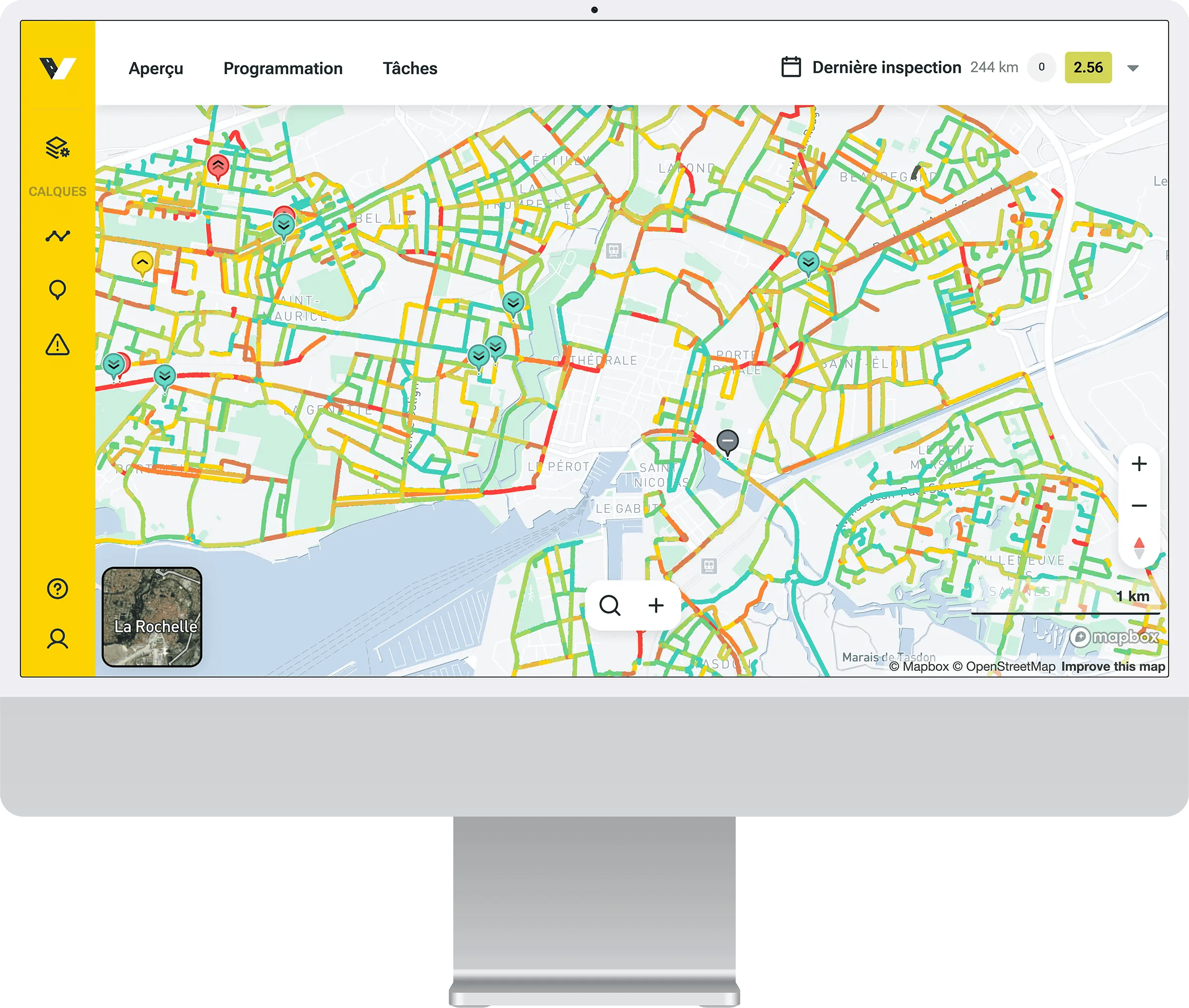 Avec vialytics, vous relevez l'état des routes et des infrastructures simplement en conduisant, grâce à l'excellente IA de vialytics. Sur la plateforme web, vous planifiez et gérez les interventions, assignez les tâches et gardez un aperçu complet de toutes les routes et infrastructures de votre commune.